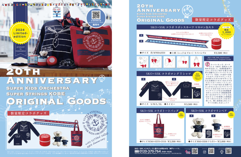 20周年コラボロゴがデザインされたお洒落なマカロン缶入りの「SKO×SSKコラボネクタイスカーフ」や「SKO×SSKコラボトートバッグ」、神戸シーバスとSKOの絆が深まるきっかけとなったオリジナルブランドboh bohの佐渡裕監督 サインロゴ入り「SKO×SSKコラボロングTシャツ」、そしてその同じデザインTシャツを着た「SKO×SSKコラボ マリンベア」を数量限定でご用意!
